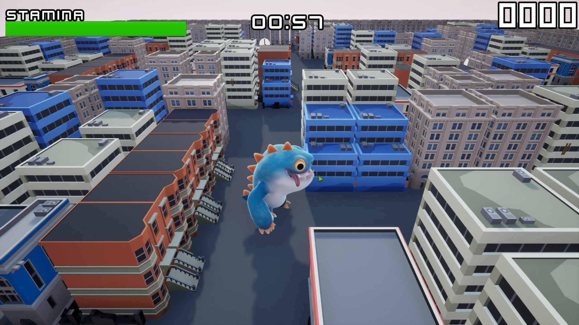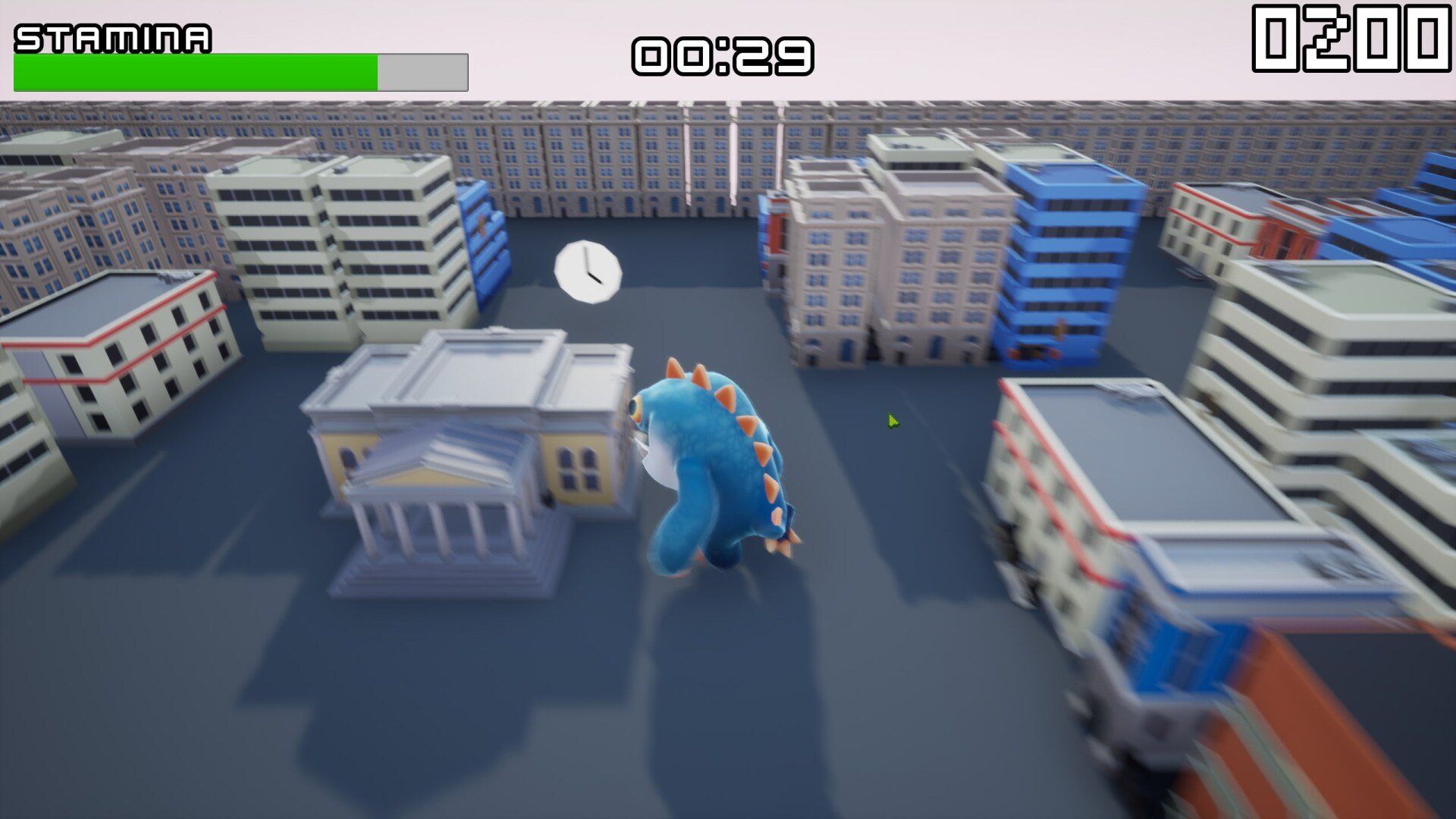 Created for Mini Jam 81, Chomps big day out is a 3rd person arcade game where the player takes control of a kaiju attacking a city. Players must damage and destroy buildings using Chomps 3 attacks, Bite, swipe and charge. Each attack uses stamina and the player must manage this stamina carefully as to avoid chomp getting tired. When the timer runs out, its not game-over yet! chomp takes his last stand and unleashes all of his power. Allowing the player to attack with no stamina drain for a short amount of time in a bonus round, bonus time can be increased by finding pickups around the city.